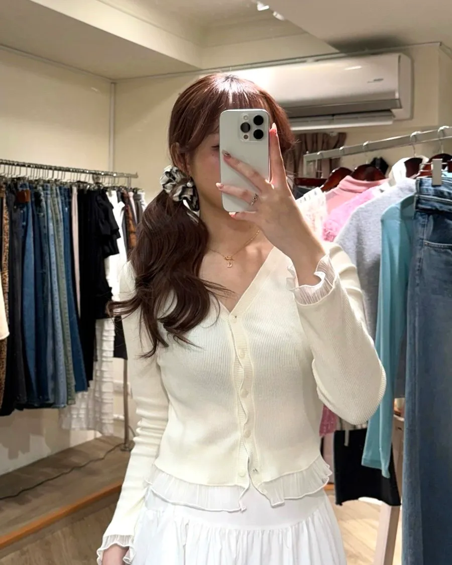 材質式細緻柔軟的彈性針織 小v領+排釦設計+下擺合和袖口的細緻荷葉邊讓整件多了一點法式層次感!